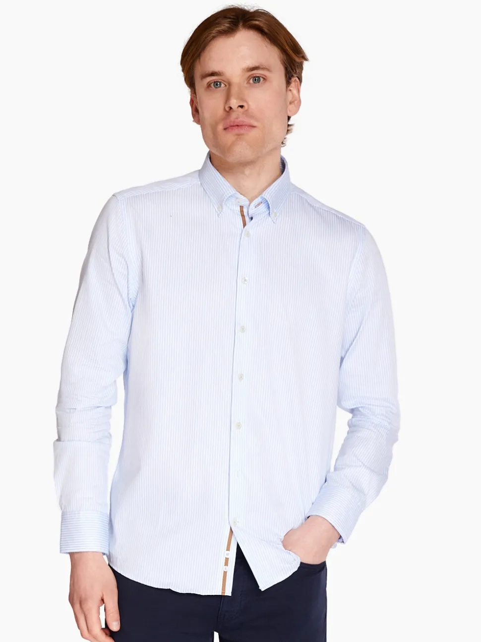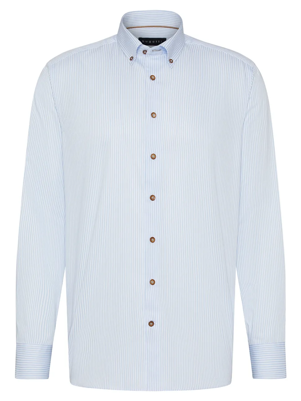 The Bugatti Easy Care Stripe Shirt offers classic style with modern ease. Crafted from 100% cotton in a regular fit, it features a timeless stripe pattern, a button-down collar, natural buttons, and buttoned cuffs. A perfect blend of sophistication and comfort for any occasion.