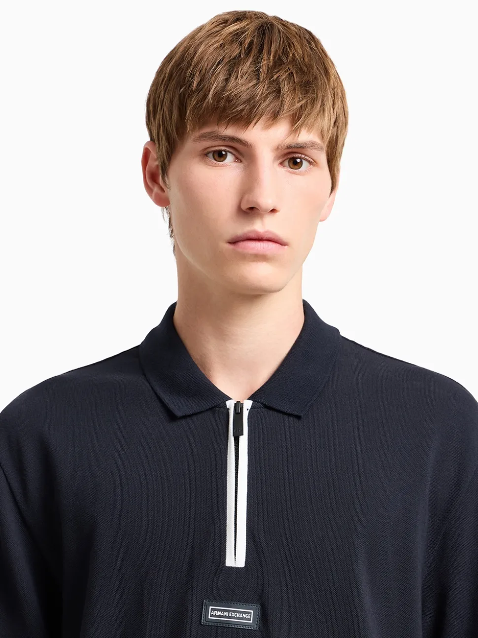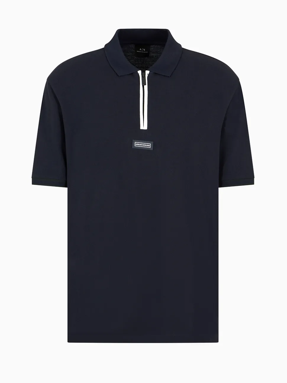 The AX Armani Collar Zip Logo Detail Polo offers a refined yet modern look, crafted from 100% cotton for ultimate comfort. Featuring a regular fit, short sleeves, and a zip closure with contrast detailing, this polo is finished with the iconic AX logo on the front, making it a stylish addition to any wardrobe.