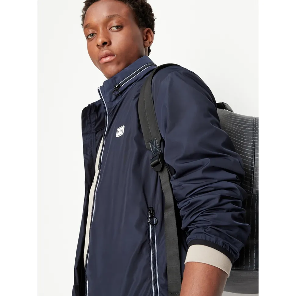 The AX Armani Lightweight Jacket. Its full zip closure ensures easy wear, while the zip pockets with contrasting details add a touch of urban sophistication. The stand collar offers extra protection against the elements while the jacket’s elasticated cuffs and drawstring hem contribute to a personalized fit. To complete the look, the iconic Armani Exchange logo patch is prominently featured on the side and on the chest. Elevate your outerwear collection with this versatile and effortlessly chic jacket from AX Armani.