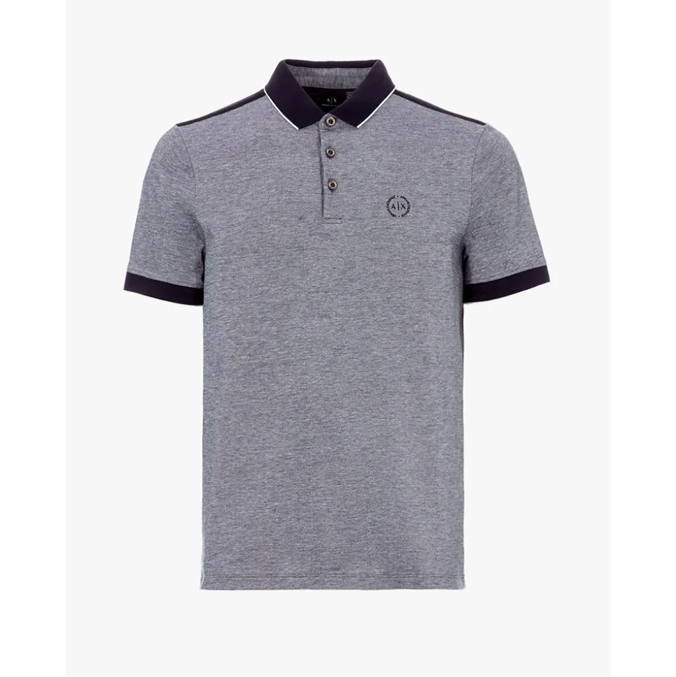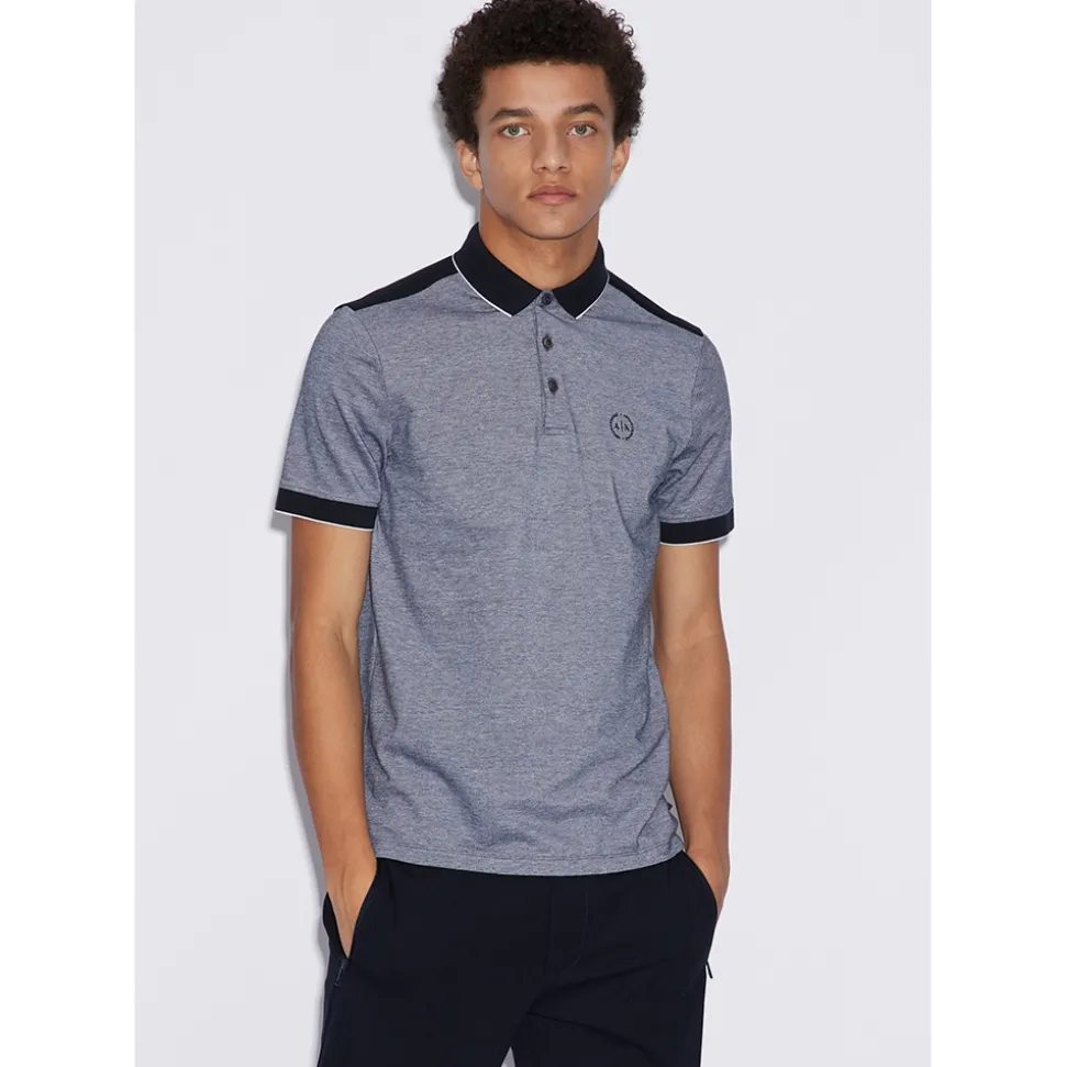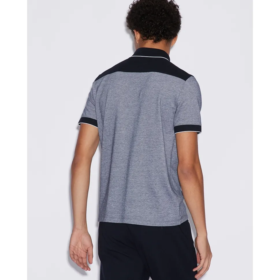 The AX Armani Two Tone Tipped Polo. Crafted from 100% cotton in a slim fit, this polo ensures both comfort and style. The contrasting navy shoulder panels, collar and sleeves create a sophisticated two-tone effect, adding a touch of contemporary flair to this classic design. Featuring a three-button closing for a polished finish, this polo is the perfect wardrobe addition. Finished off with the AX logo on the chest. Pair with jeans and white trainers for the perfect look!