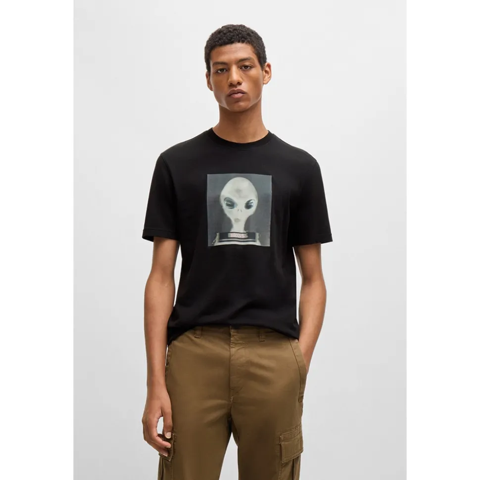 The Boss Alien T-shirt is crafted from 100% cotton, offering a regular fit with short sleeves and a classic crew neck. The standout Boss artwork on the front adds a bold, modern touch. Style it with jeans and trainers for a casual look, and layer it with a denim jacket or casual blazer for a more polished outfit.