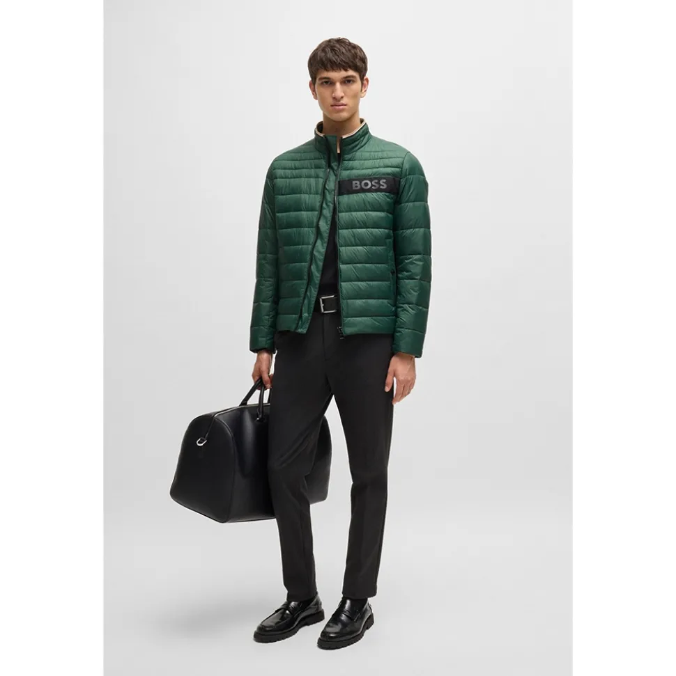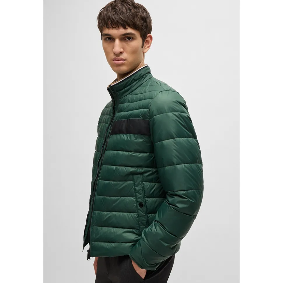 The Darolus water-repellent jacket in open green by Boss. Fashioned from sustainabily source recycled lightweight materials that uphold the BOSS responsible products guarantee. With your comfort in mind the cross stitched padded pattern offers insulation and movability. Features such as the stand up collar, full zip closure, two button front torso pockets, signature BOSS branding along the left chest and subtle collar tipping make for a complete piece. Add to your outfit with BOSS chinos and casual shoes for your next winter walk.