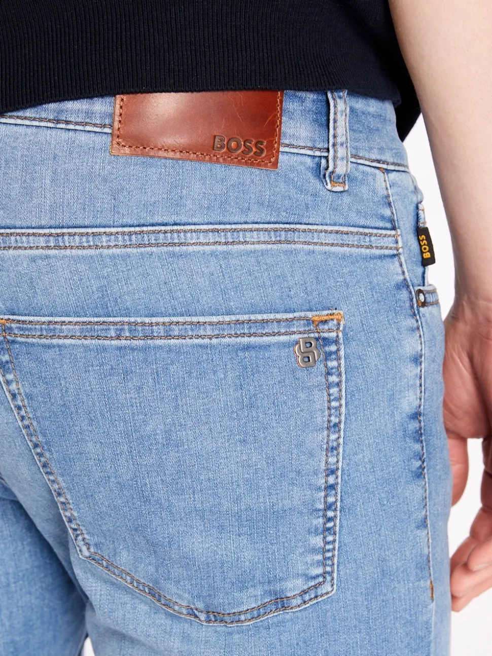 The BOSS Delaware Slim Fit Jeans offer a sleek and modern look, crafted with stretch for all-day comfort and easy movement. Cut with a slim leg, they feature classic belt loops, a zip-button closure, and two front and two back pockets. A signature BOSS logo patch on the back waistband adds a refined finishing touch. Perfect for effortless smart-casual styling.