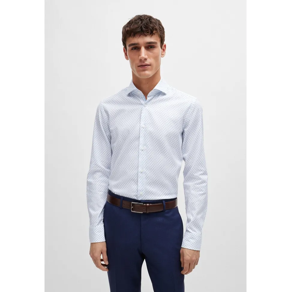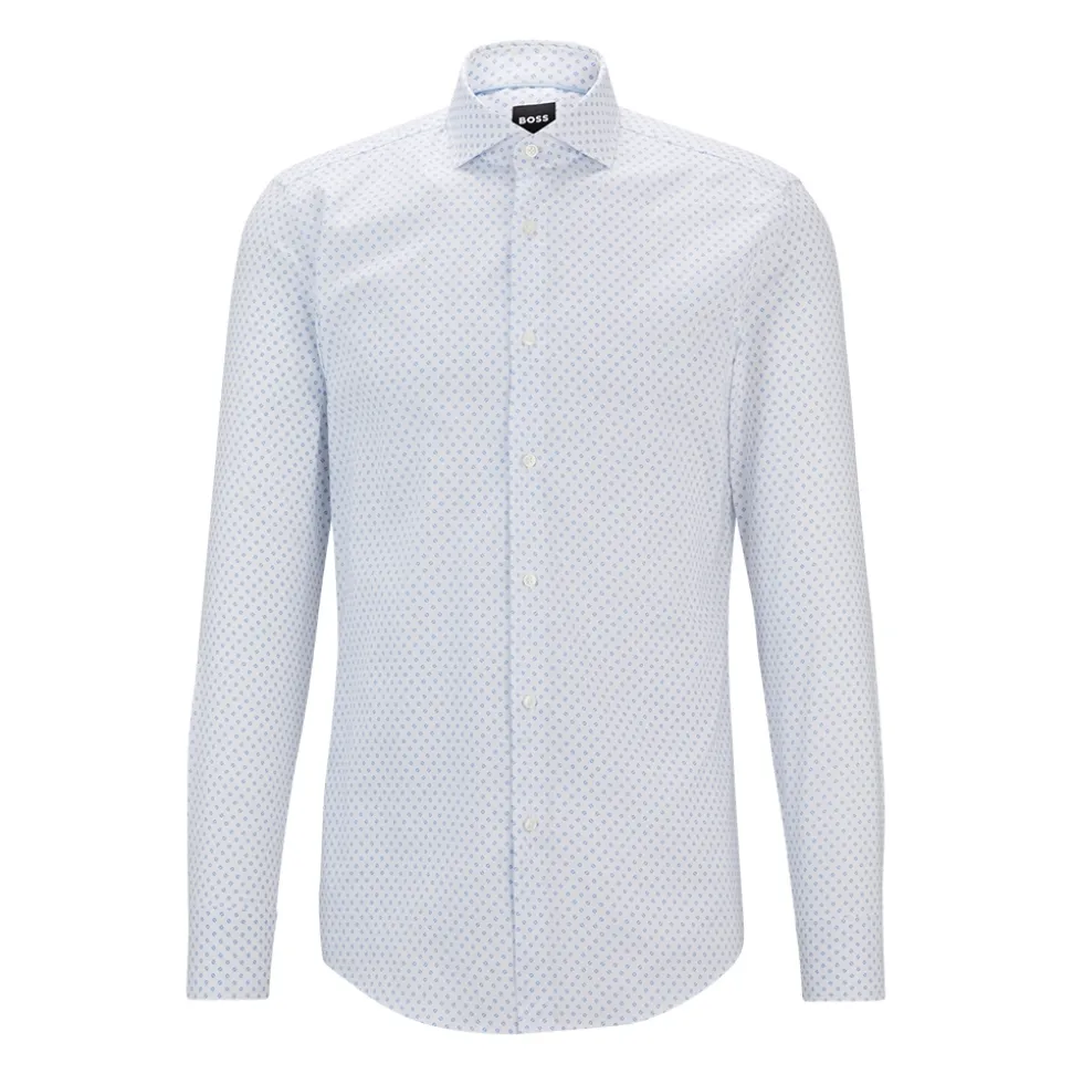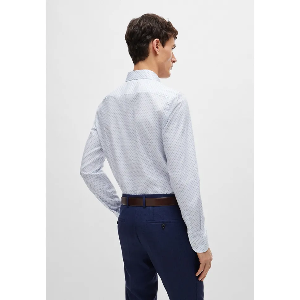The Boss H Hank C5 Shirt is a stylish slim-fit shirt made from comfy stretch cotton. It features a cool, subtle geometric pattern all over and is finished off with pearl buttons and button cuffs. Perfect for dressing up or down, you can pair it with dark jeans and loafers for a smart-casual look, or with dress pants and a blazer for a more polished outfit. This shirt adds a touch of modern flair to any wardrobe.