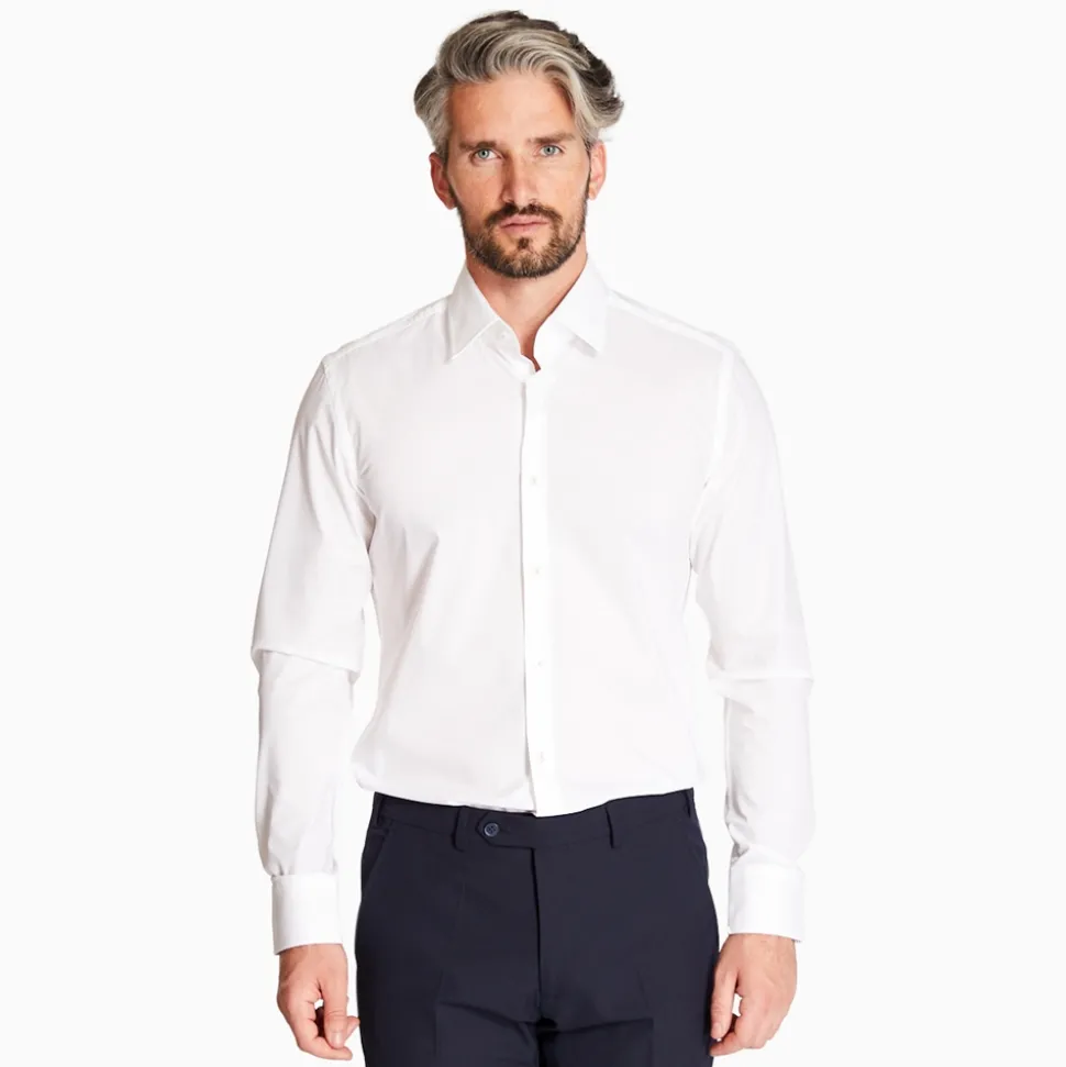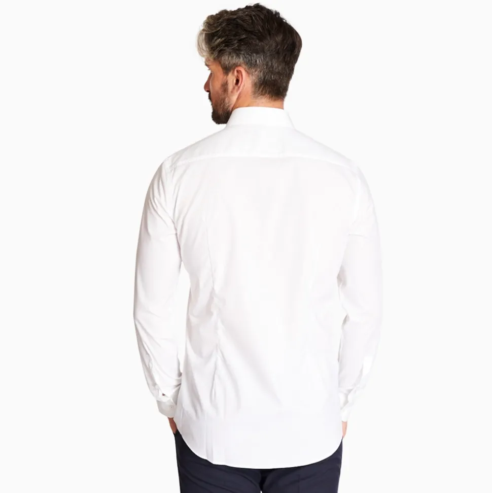The Hank soft cotton slim fit formal shirt by BOSS menswear in blue. Fashioned from a stretch cotton blend to provide a light and breathable wearing experience. Featuring a spread collar, full button placket with pearl buttons double button cuffs and a rounded waist hem. Subtle BOSS tape lining along the inner collar provides the perfect finishing touch. Layer under a full BOSS suit with for a complete formal look or ideal for pairing with jeans for a smart-casual look.