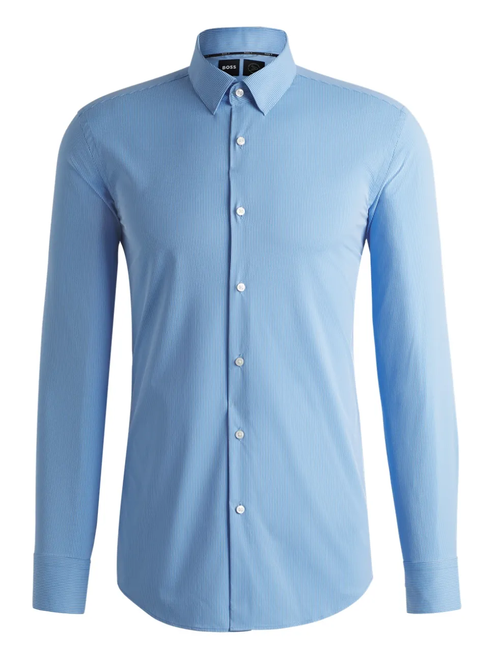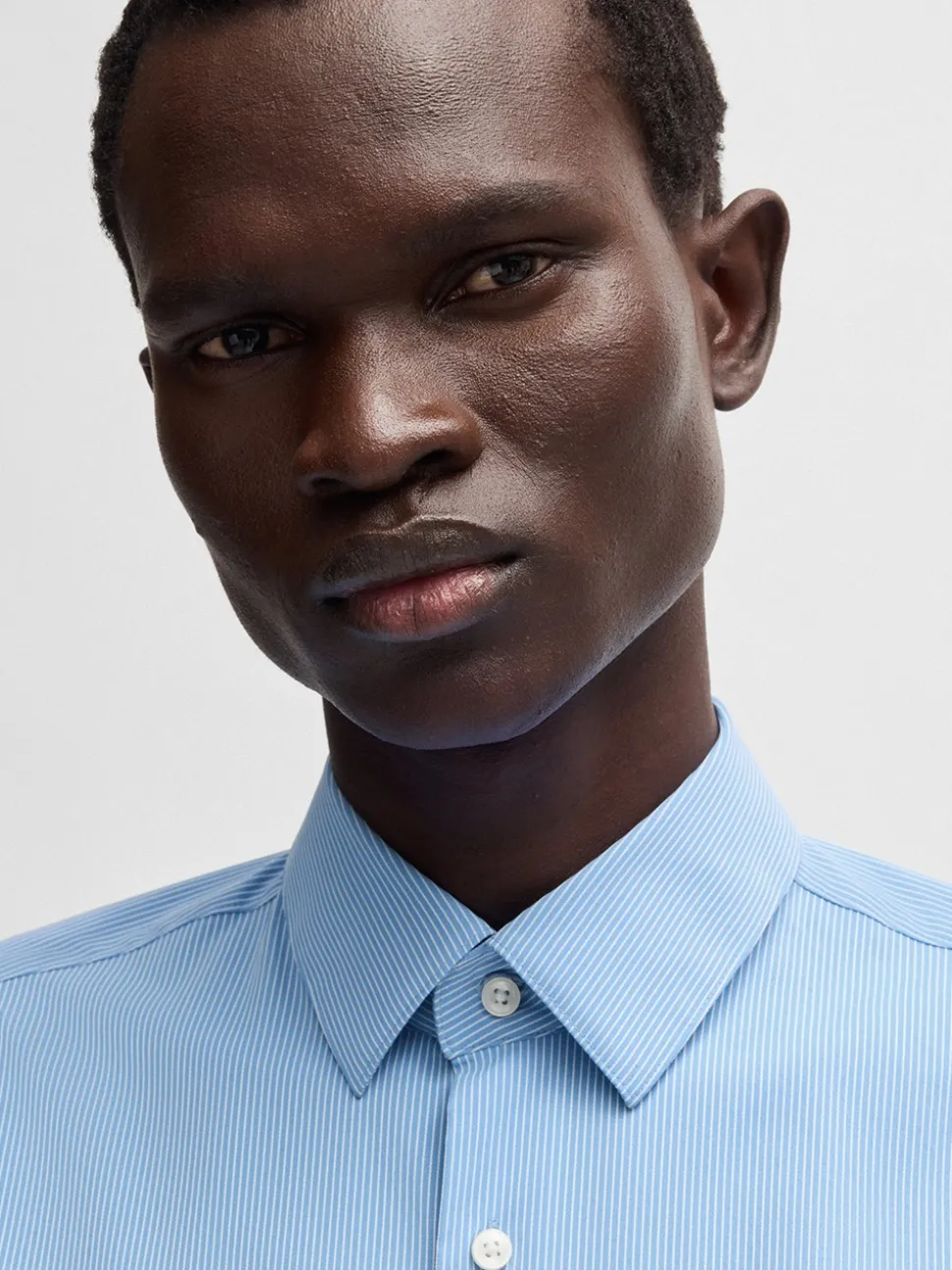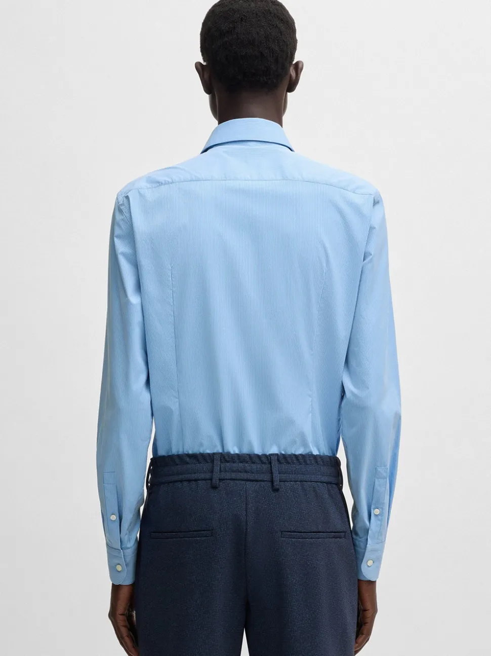 The BOSS H-Hank Spread C1-222 Shirt is a sleek and sophisticated choice, featuring a slim fit, refined stripe pattern, and elegant pearl buttons. With long sleeves and buttoned cuffs, it’s perfect for both formal and smart-casual occasions. Pair it with tailored trousers and a blazer for a polished look or dress it down with chinos and loafers for effortless style.