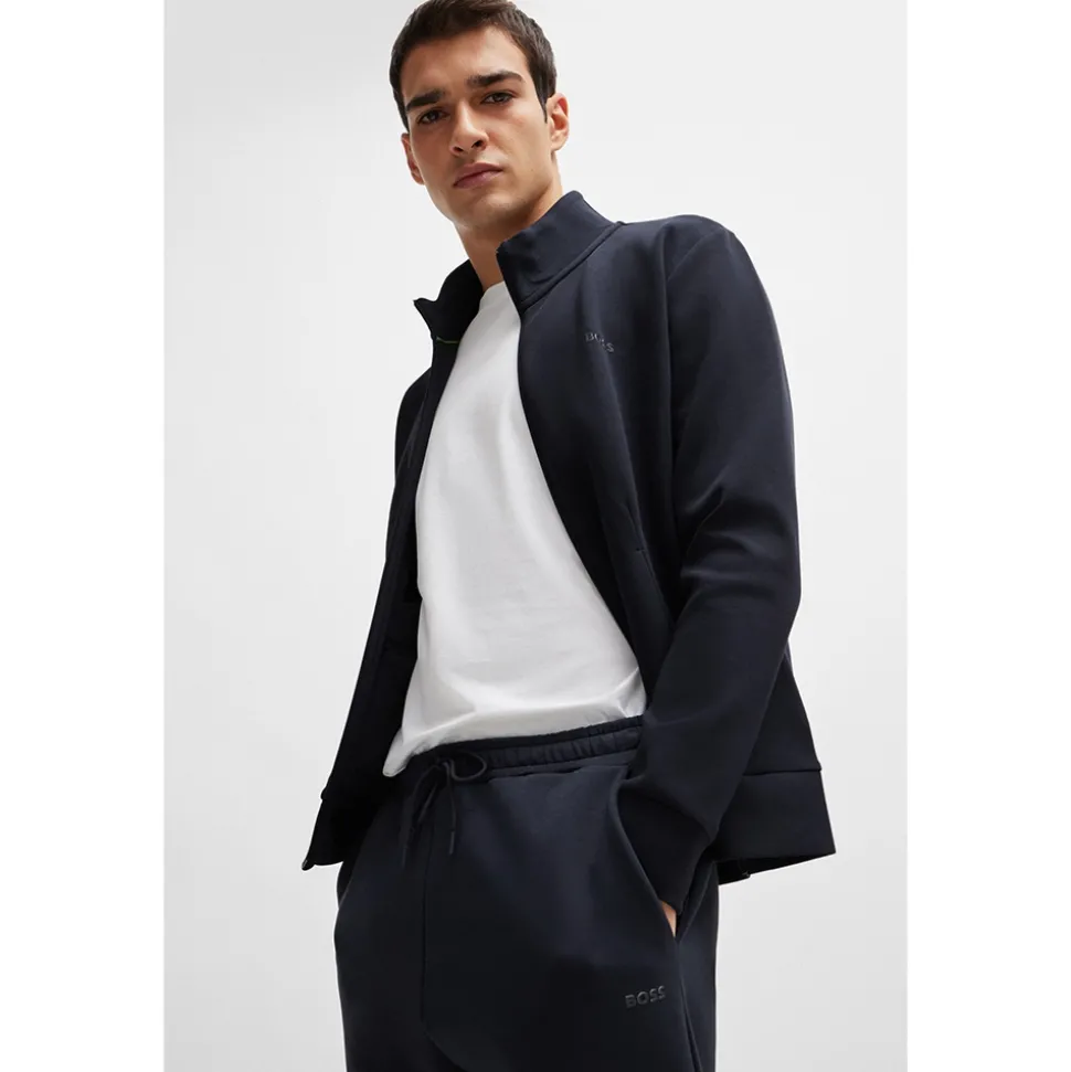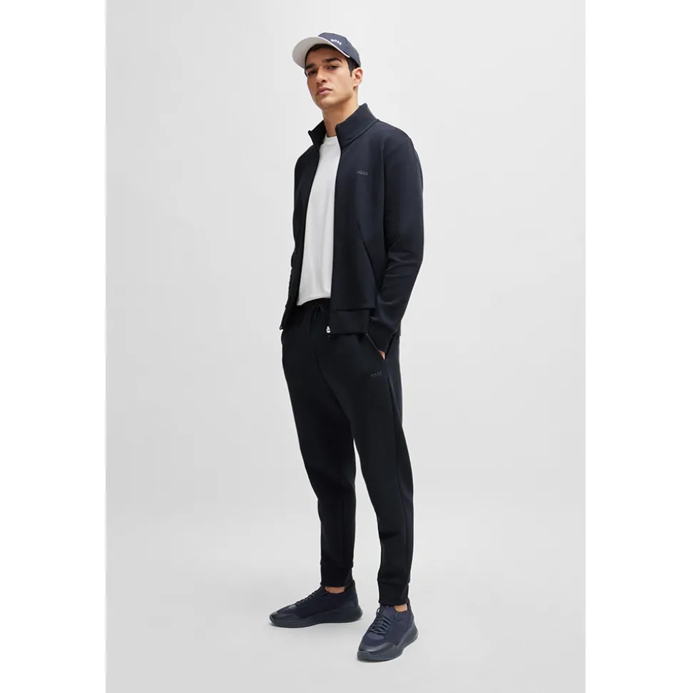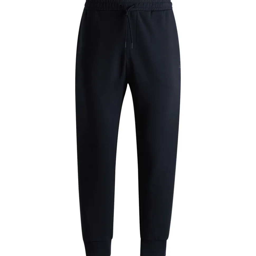 BOSS Menswear Hadiko Tracksuit Bottoms in Navy. Looking your best just got easier with these regular fit tracksuit bottoms with a cuffed hem two front pockets an elasticated waistband with drawstring and a curved logo on the left side of the tracksuit bottoms. Crafted in a double-faced cotton jersey material with tonal fabric in a piqu? structure these modern and sporty bottoms will have you looking effortlessly on trend this season.