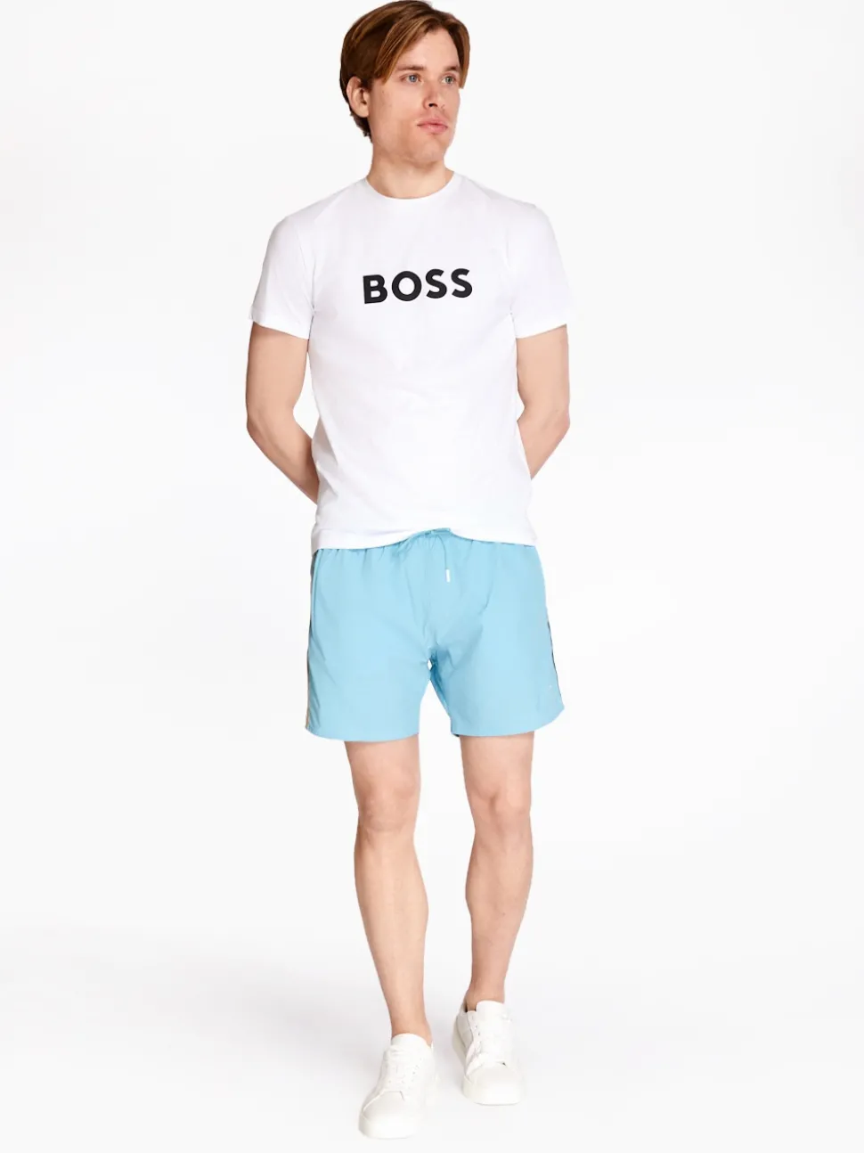 The BOSS Iconic Swim Shorts are a stylish beach essential, featuring a fully lined design for comfort. Detailed with signature stripes and the BOSS logo, they offer a sleek and sophisticated look for your swimwear collection.