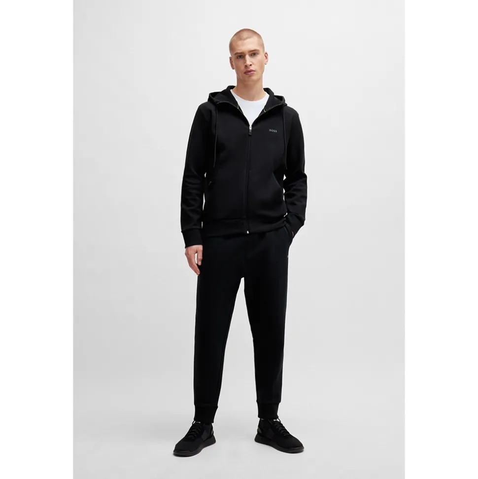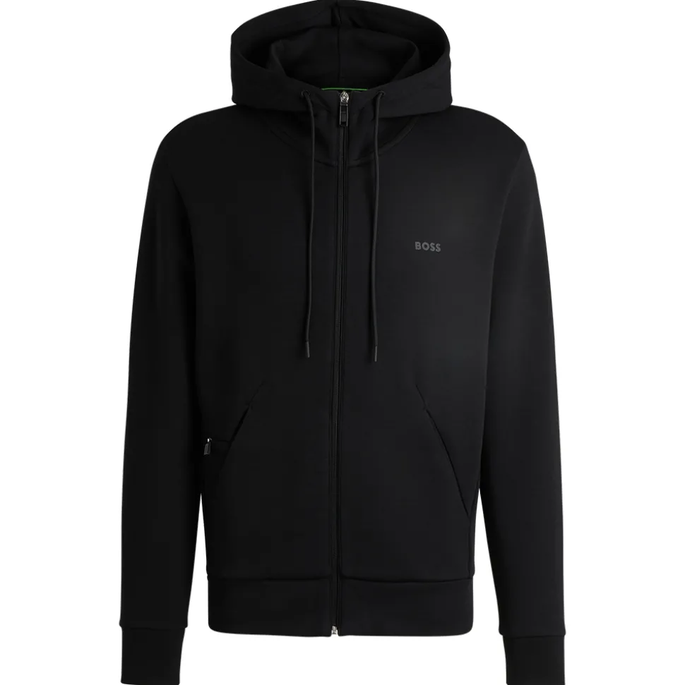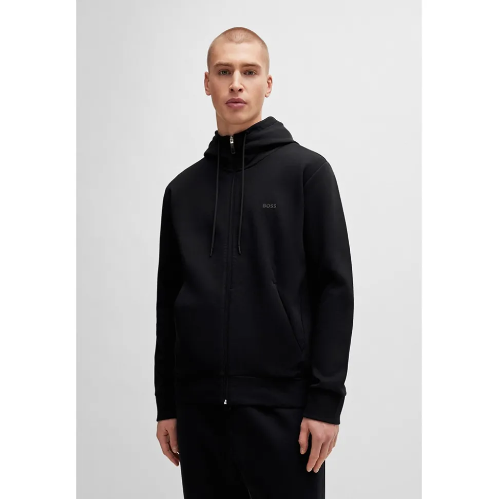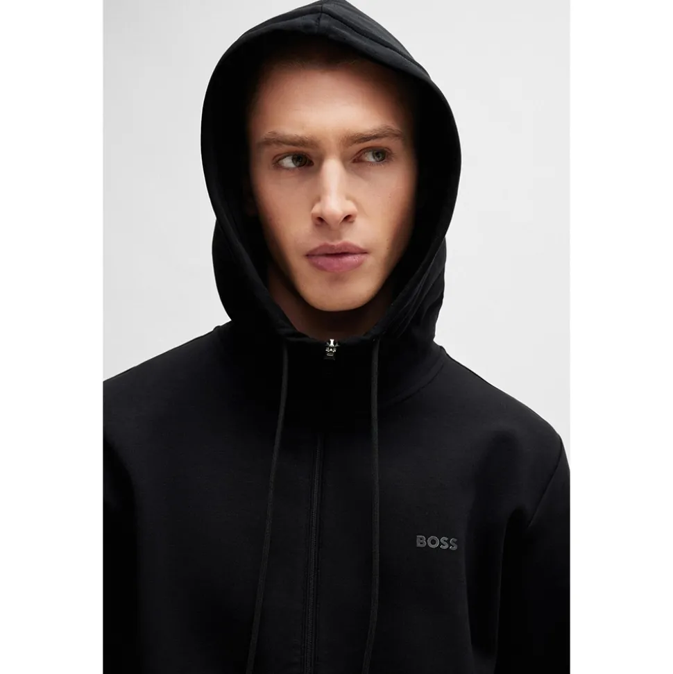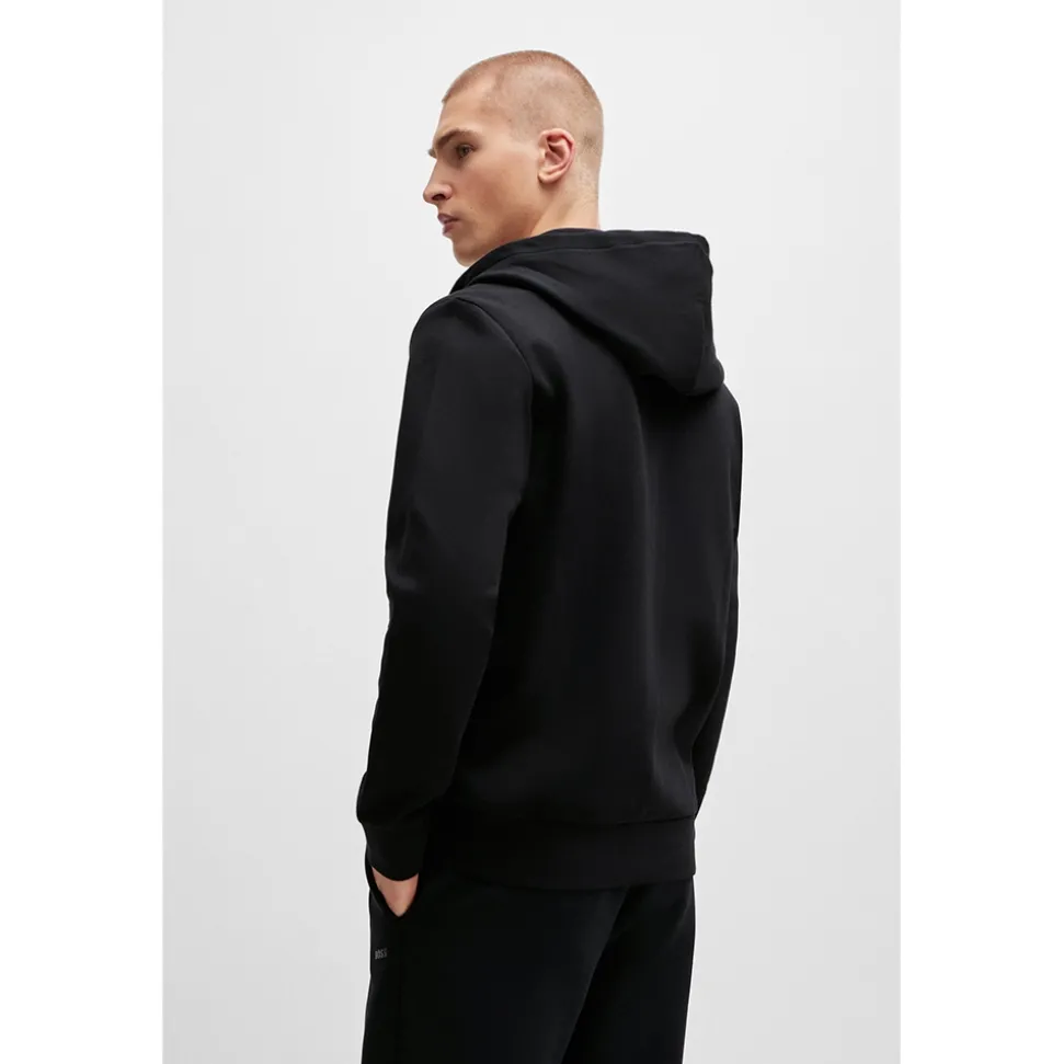 A hooded sweatshirt from BOSS Menswear the Saggy sweatshirt in black will keep you comfortable whilst looking stylish. Crafted in a double faced cotton jersey material with a back panel in a piqu? structure. Styled in a regular fit it is complete with drawstring hood and zip through this sporty style is detailed curved BOSS logo on the chest. Featuring side entry pockets with additional zipped pocket this sweatshirt is a great on the go option when you still want to look you best.