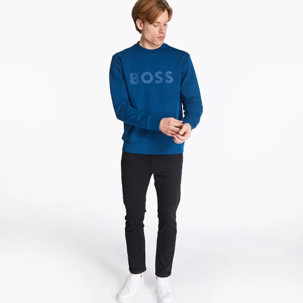 Introducing the Boss Salbo Sweat features a regular fit with a classic crew neck and long sleeves, offering both comfort and style. Elasticated cuffs and hem ensure a snug fit, while the Boss logo on the chest adds a signature touch. Pair it with jeans and trainers for the perfect casual look.