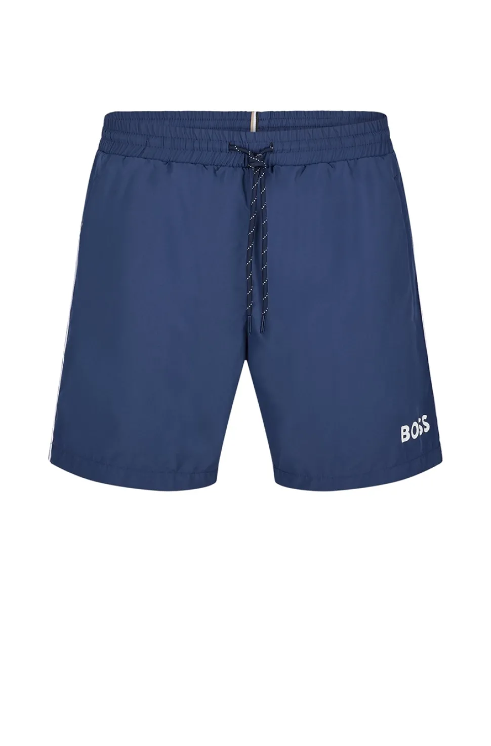 BOSS Starfish Fully lined swim shorts by BOSS in Navy. Featuring contrast piping and a BOSS logo, these quick-drying swim shorts are detailed with a signature-stripe trim at the rear waistband. Designed in a medium length swim shorts will have you feeling cool and looking on top of your style game this season.
