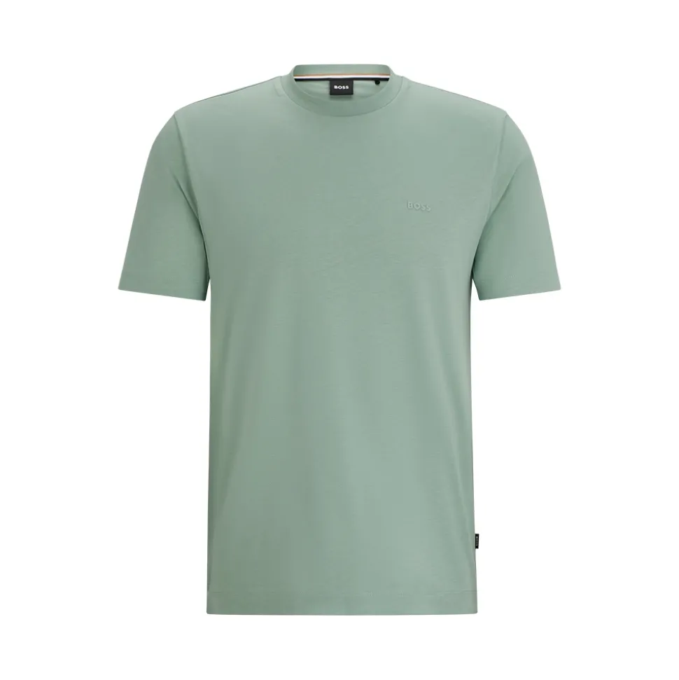 The Boss Thompson 01 Tee in open green. Crafted from pure-cotton jersey, this T-shirt offers a soft and breathable feel against the skin. It features a straight fit, providing a classic and relaxed silhouette.The rubber-printed BOSS logo at the chest adds a touch of modernity and sophistication, elevating the overall look. Inside the collar, you’ll find a signature stripe that adds a subtle pop of color and a distinctive element. Whether you’re running errands or meeting friends, this BOSS Menswear T-shirt ensures both comfort and a touch of refined style.