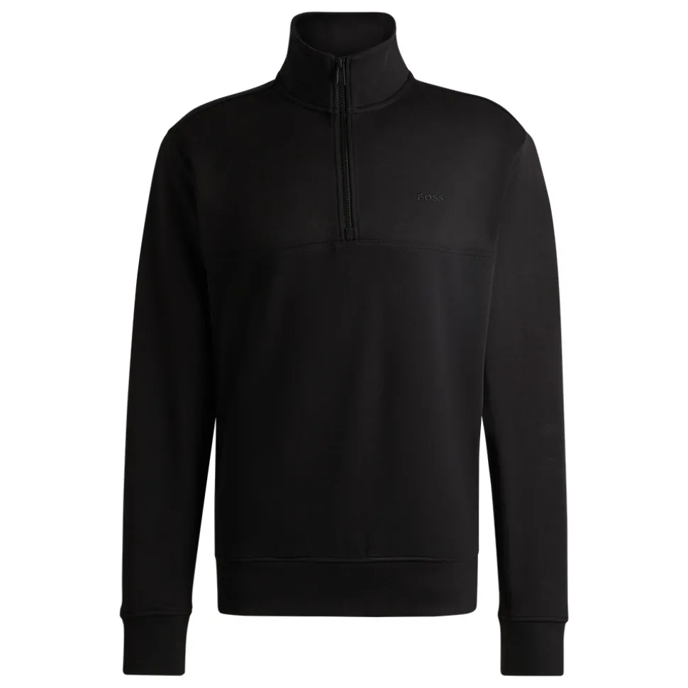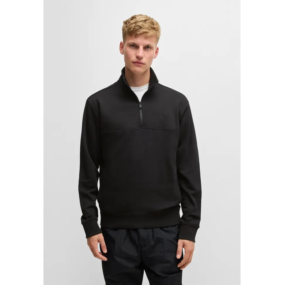 The Boss Ze Corduroy Quarter Zip is a relaxed-fit sweatshirt crafted from pure-cotton fleece for exceptional comfort. Featuring a quarter-zip neck with corduroy detail and long sleeves, it is finished with a subtle Boss logo detail at the chest. This versatile layer pairs effortlessly with jeans, a white tee, and trainers for a polished yet casual look.