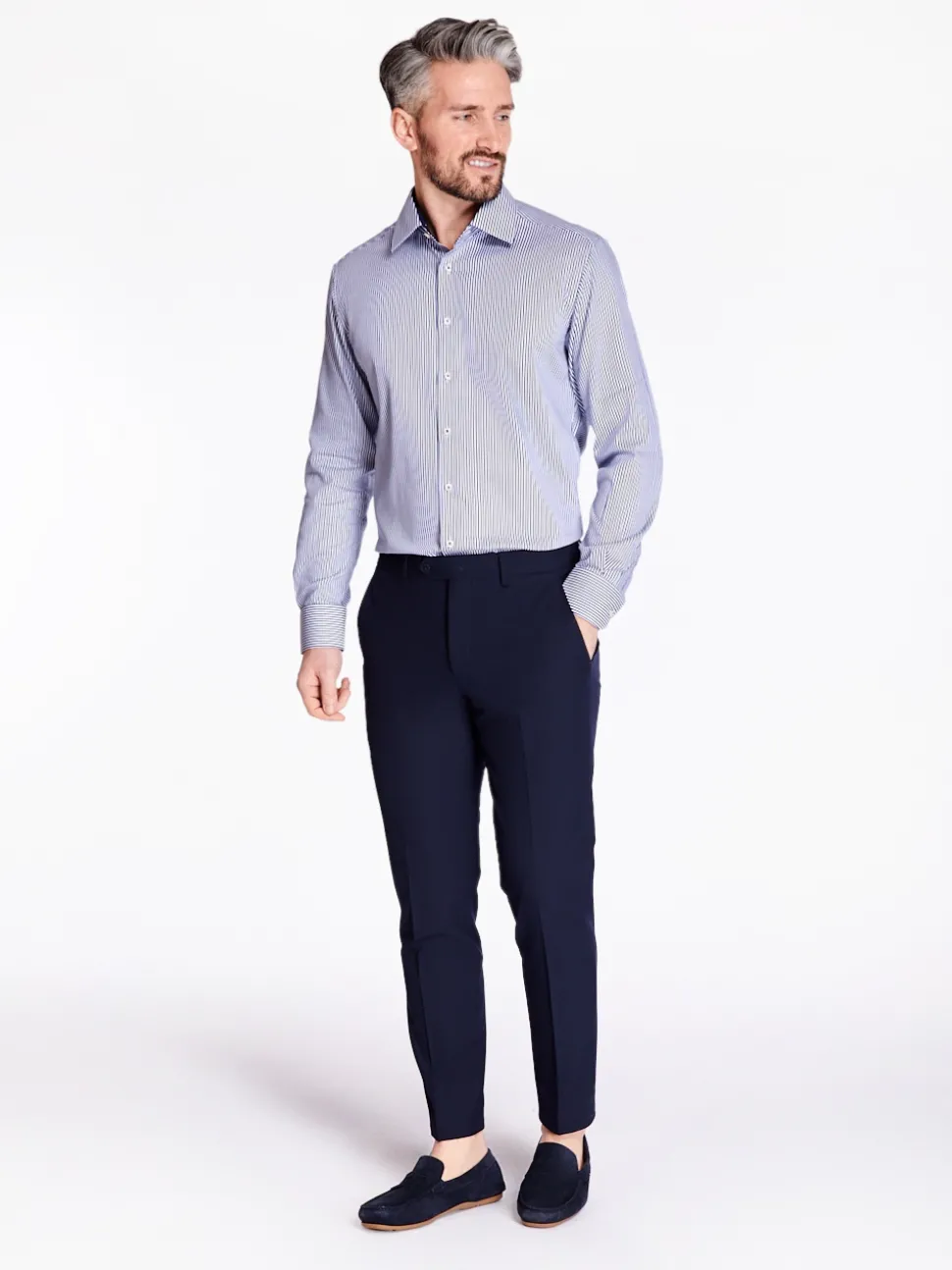 The Eterna Stripe Shirt is a sleek, slim-fit shirt with a stand out stripe pattern. Featuring pearl buttons with navy stitching, a spread collar, and button cuffs, it offers a polished look. The contrast navy inner collar adds a modern touch, making it a stylish choice for any occasion.