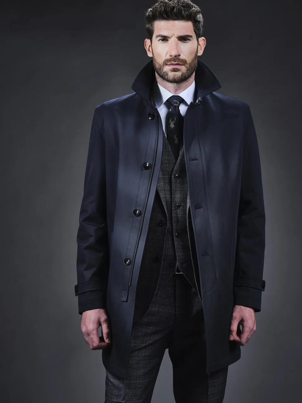 The Herbie Frogg Raincoat in navy is the epitome of traditional elegance. Crafted from a high percentage of cotton to create a durable yet buttery soft outer and finished with a cutaway shaped collar with a hook closure, full zip frontal fastening with additional button closure, two side vent pockets, stylish button detailed sleeve straps and a single vented rear, this classic raincoat is a true staple. Layer over your favourite suit to stay dry while on your morning commute or simply pair with smart-casual chinos and a chelsea boot to navigate the more casual rainy day.