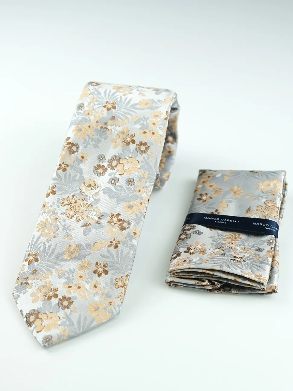 Marco Capelli Floral 7.5cm Tie With Pocketsquare – Silver