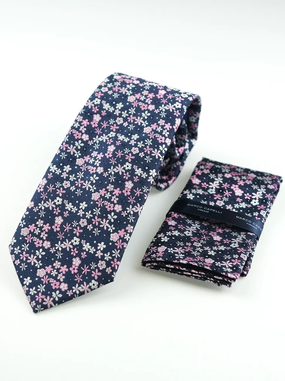 Marco Capelli Mini Floral 7.5cm Tie With Pocket Square – Navy
