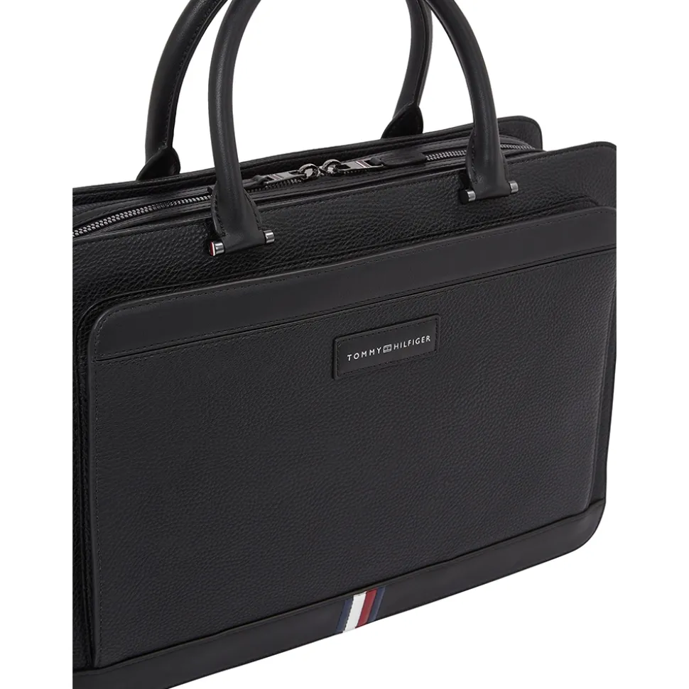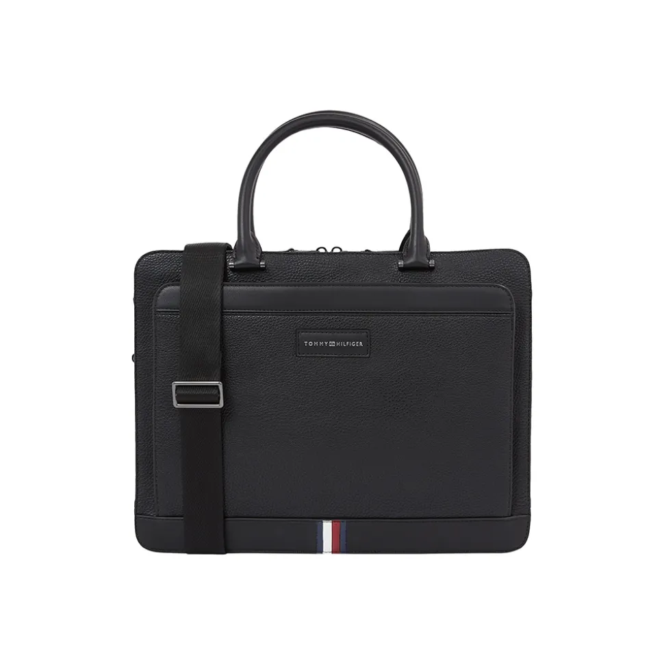 The Tommy Hilfiger Business Slim Computer Bag. It features a sleek pebble grain finish with contrast texture panels for a refined look. Designed with a built-in padded laptop sleeve, it ensures your device stays protected. The bag offers a double zip closure, two main compartments, and multiple interior card and pen slots for optimal organization. With two top handles, an adjustable removable crossover strap, and a convenient trolley strap, this bag is versatile and easy to carry, making it an essential accessory for business travel.