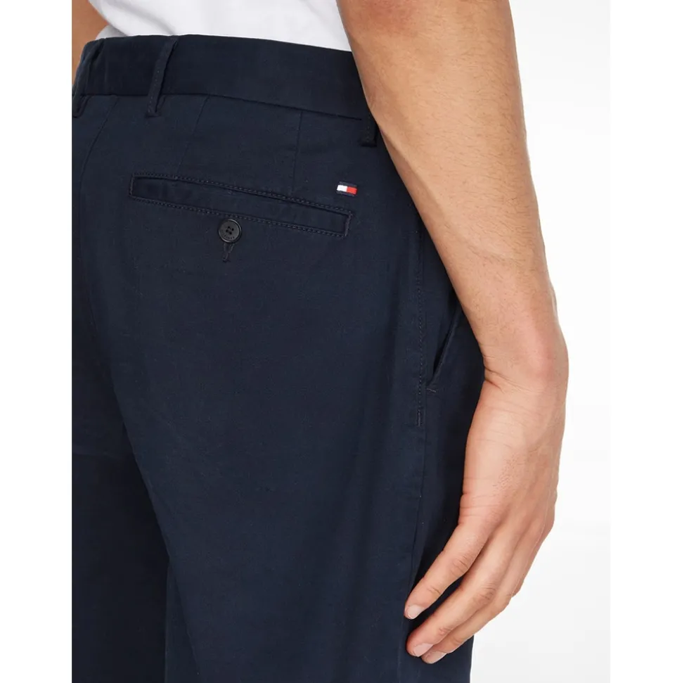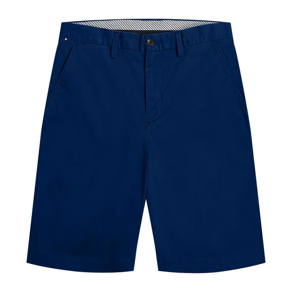 A relaxed tapered fitting navy chino short by Tommy Hilfiger. Elevate every look with these chino shorts featuring a five pocket design, a zip fly, top button fastening, six belt loops around the waistband and a subtly embroidered Tommy Hilfiger logo above the back right pocket. Completed with a reactive wash treatment and a brushed finish, to ensure that the satin fabric is super soft, offering everyday wearing comfort. We guarantee these chino shorts will be your go to summer outfit choice.