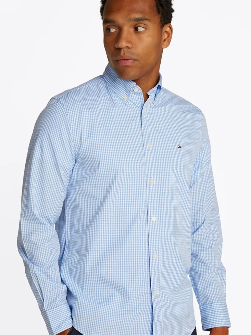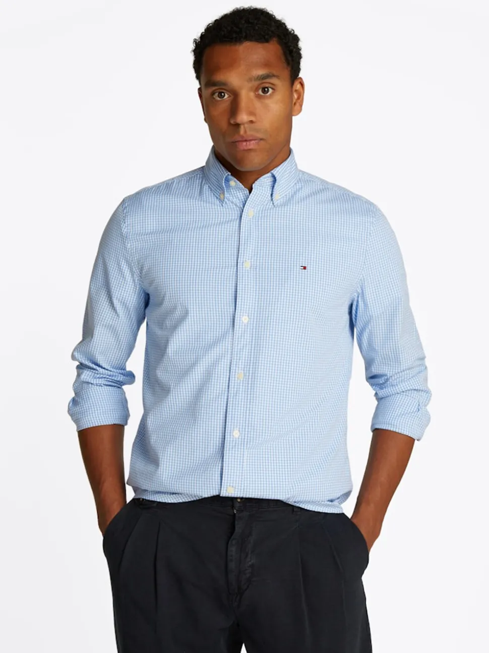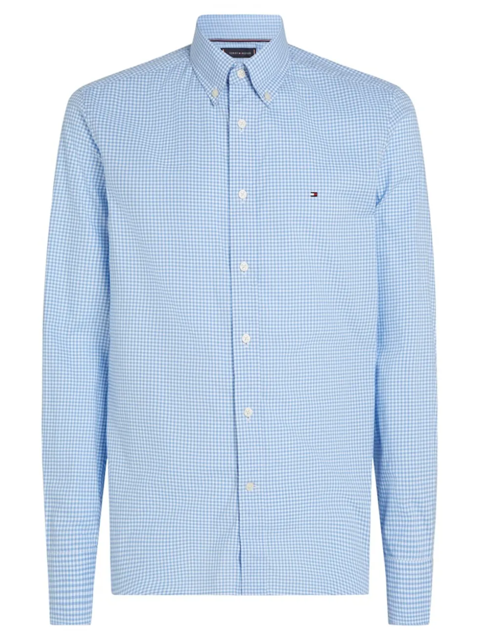 The Tommy Hilfiger Poplin Gingham Shirt. Crafted from 100% cotton for breathable comfort, this regular-fit shirt features a classic all-over gingham check pattern that’s both versatile and sophisticated. Designed with a button-down collar for a polished look, it’s finished with the signature Tommy Hilfiger flag embroidery on the chest, adding a touch of iconic branding. Ideal for smart-casual occasions or everyday wear.