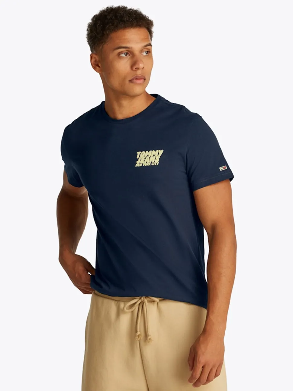 The Tommy Jeans Bubble Print T-Shirt is a stylish essential with a modern edge. Crafted from 100% cotton for all-day comfort, this slim-fit tee features a classic crew neck and short sleeves. The standout Tommy Jeans bubble logo on the chest adds a bold, signature touch, making it a perfect casual staple.