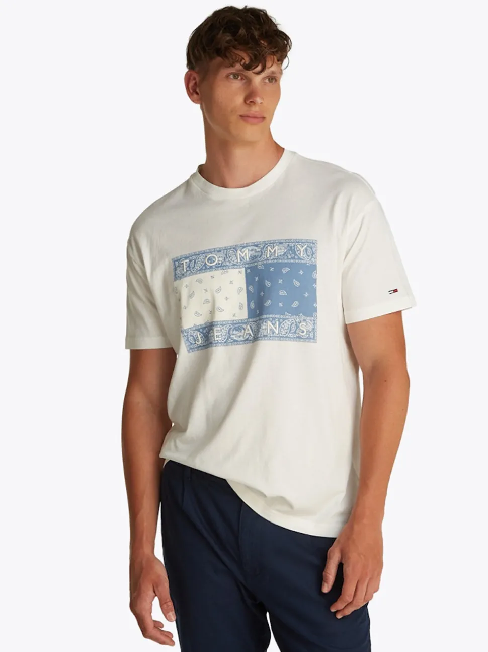 The Tommy Jeans FLAG T-SHIRT is a classic staple with a regular fit, crafted from 100% cotton for ultimate comfort. Featuring short sleeves and a bold Tommy Jeans flag print on the front, it’s a versatile piece for effortless casual style.Pair with a lightweight jacket and your favourite Tommy jeans for a cool laidback look!