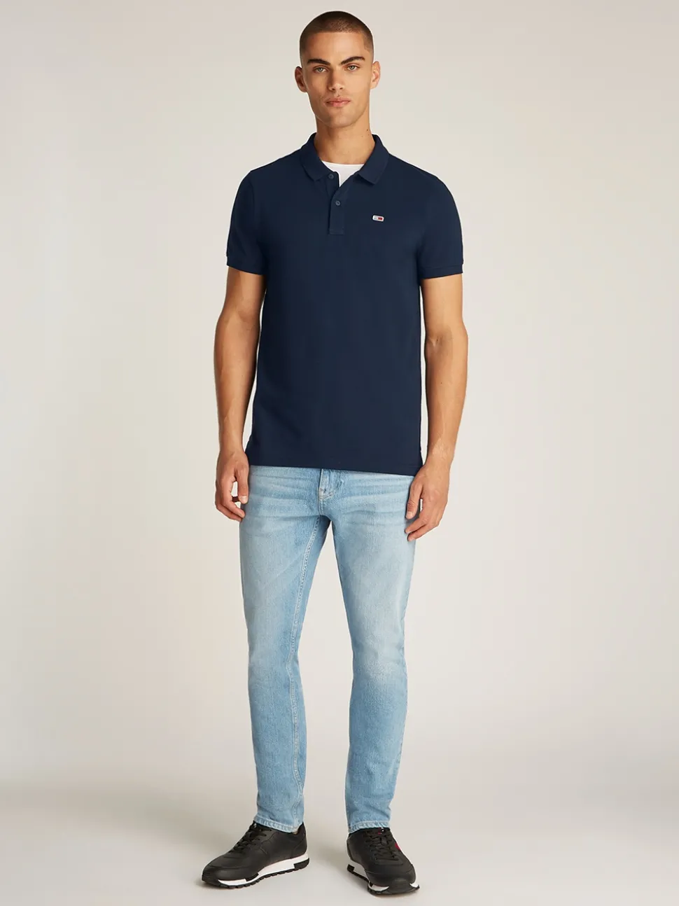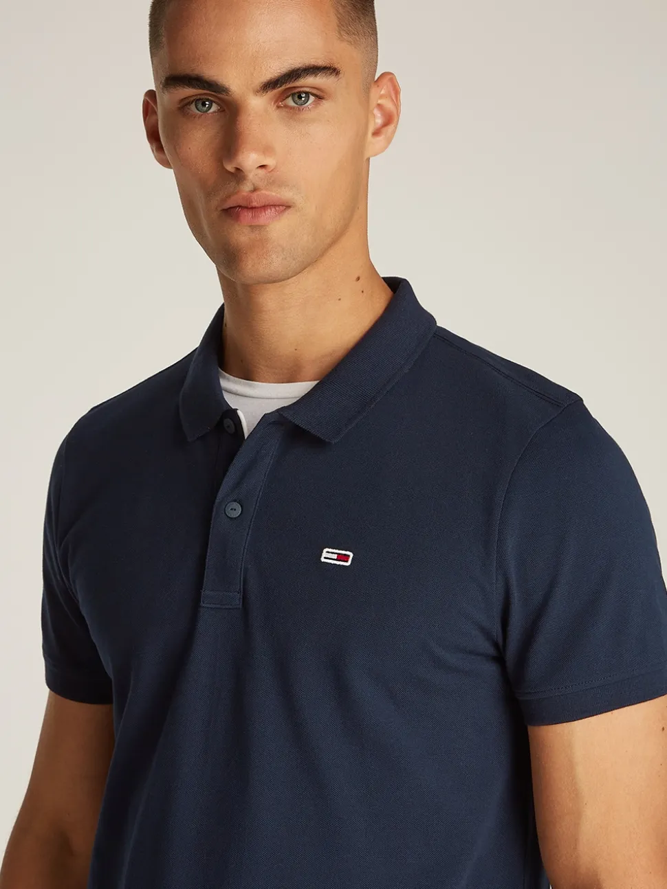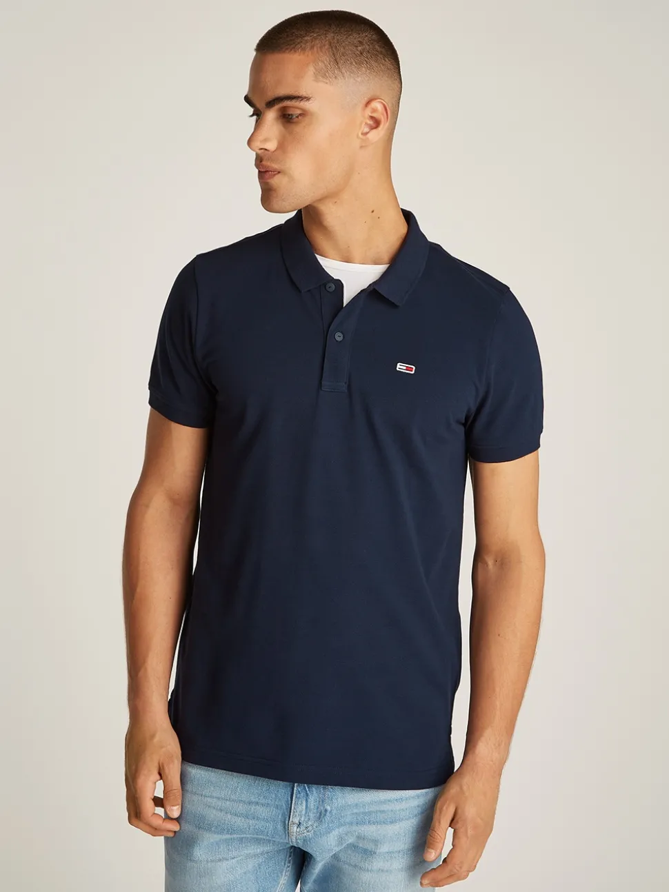 The Tommy Jeans Placket Polo is a stylish, slim-fit polo shirt crafted from 100% cotton for breathable comfort. This short-sleeve design features a two-button closure and a distinctive contrast detail on the collar, adding a modern twist to a classic look. The iconic Tommy logo on the chest completes the look, making it a versatile and timeless piece ideal for casual and smart-casual outfits.