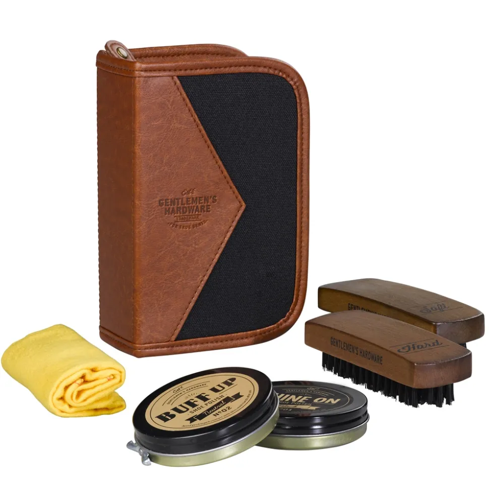 Compact case featuring faux-leather accents, equipped with two brushes, two polish tins, and a cleaning cloth. Elevate your footwear care routine with this comprehensive advanced kit.